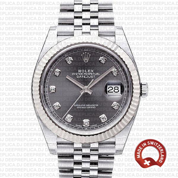 Rolex Datejust 41 Jubilee Dark Rhodium Grey Diamond Dial 904L Steel 18k White Gold Fluted Bezel 41mm Swiss Replica Watch