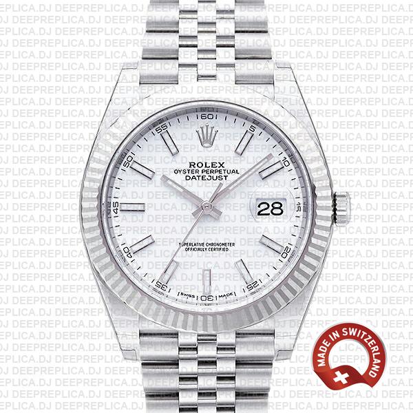 Rolex Datejust 41 Oyster White Dial Stick Markers 904L Steel 18k White Gold Fluted Bezel 41mm Swiss Replica Watch