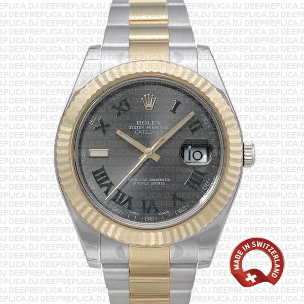 Rolex Datejust ΙΙ Oyster 2-tone 18k Yellow Gold/904L Steel Fluted Bezel Slate Grey Dial Green Roman Markers 41mm Swiss Replica Watch