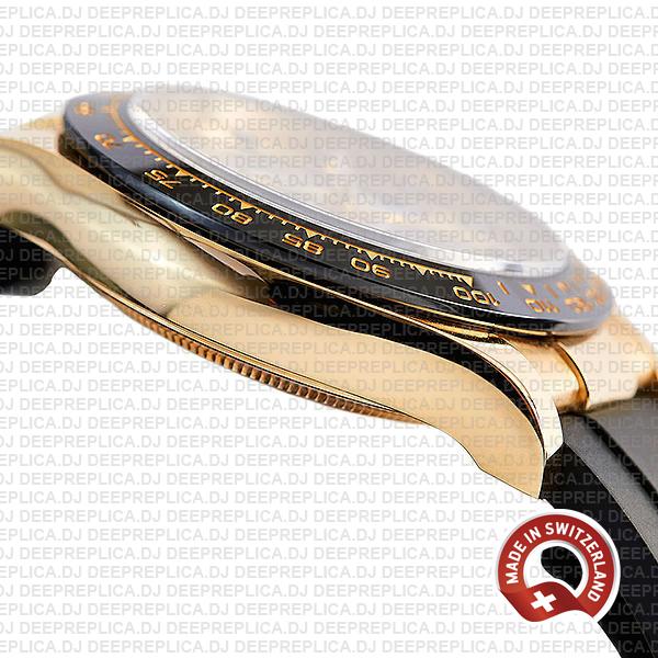 | BEZEL | – Black monobloc solid Ceramic. Fixed (does not move) with engraved tachymetric scale – 18k Yellow gold coated numerals and graduations – Construction and design 100% same as Genuine |