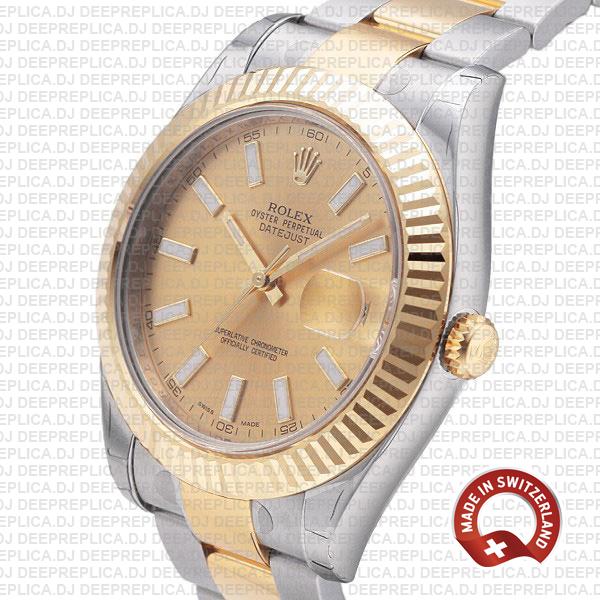 Rolex Datejust ΙΙ Oyster 2-tone 18k Yellow Gold/904L Steel Fluted Bezel Gold Dial Stick Markers 41mm Swiss Replica Watch