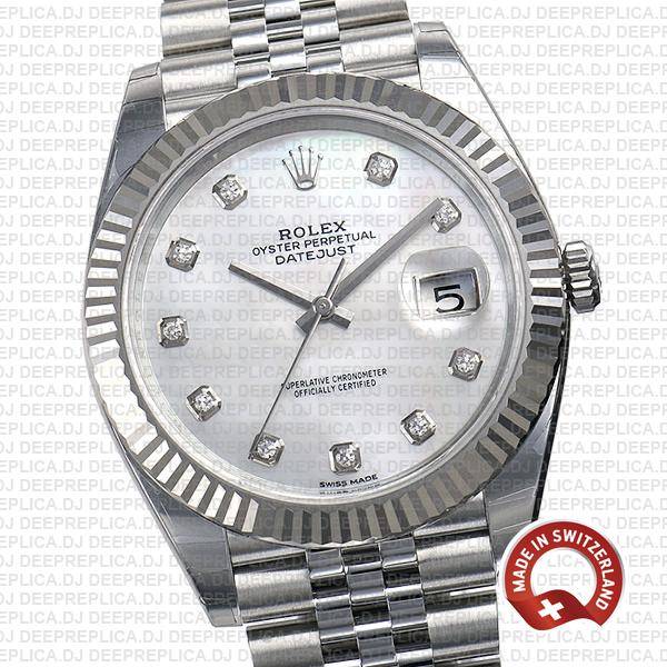 Rolex Datejust 41 Jubilee White MOP Diamond Dial 904L Steel 18k White Gold Fluted Bezel 41mm Swiss Replica Watch