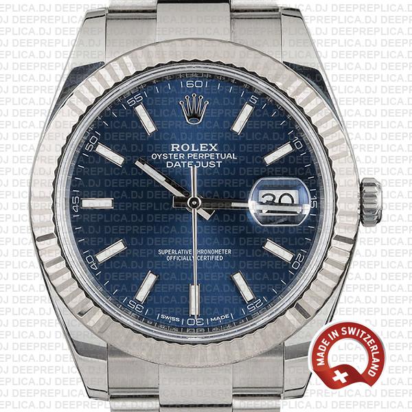 Rolex Datejust 41 Oyster Blue Dial Stick Markers 904L Steel 18k White Gold Fluted Bezel 41mm Swiss Replica Watch