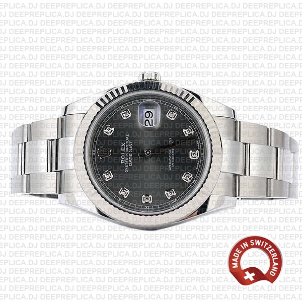 Rolex Datejust 41 Oyster Dark Rhodium Grey Diamond Dial 904L Steel 18k White Gold Fluted Bezel 41mm Swiss Replica Watch